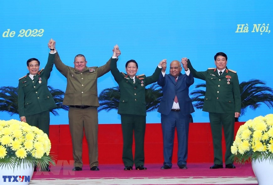 Trung tướng Vicstor Joho Ramos, Chủ nhiệm Chính trị các Lực lượng vũ trang cách mạng Cuba và Đại sứ Cuba tại Việt Nam Orlando Nicolas Hernandez Guillen trao Huân chương cao quý các loại của Nhà nước Cuba cho Đại tướng Phan Văn Giang, Bộ trưởng Bộ Quốc phòng; Đại tướng Lương Cường, Chủ nhiệm Tổng cục Chính trị QĐND Việt Nam và Đại tướng Ngô Xuân Lịch, nguyên Bộ trưởng Bộ Quốc phòng (2022). (Ảnh: Trọng Đức/TTXVN)