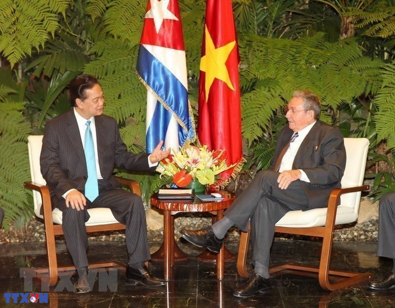 Thủ tướng Nguyễn Tấn Dũng và Chủ tịch Hội đồng Nhà nước và Hội đồng Bộ trưởng Cuba Raul Castro Ruz hội đàm tại Cung Cách mạng ở thủ đô Havana trong chuyến thăm chính thức Cuba từ ngày 26-28/3/2014. (Ảnh: Đức Tám/TTXVN)