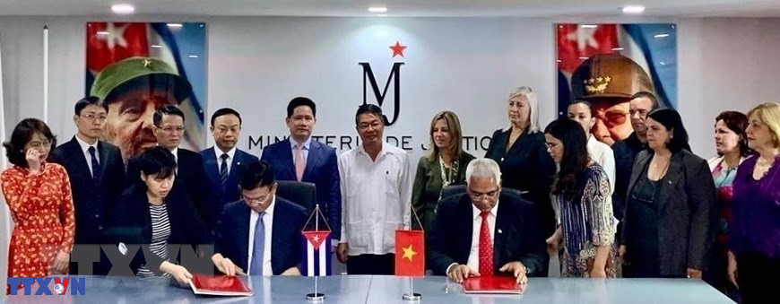 Bộ trưởng Tư pháp Lê Thành Long và Bộ trưởng Tư pháp Cuba Oscar Manuel Silvera Martínez ký “Ý định thư về xây dựng Dự án hỗ trợ kỹ thuật cho Bộ Tư pháp Cuba.” (Ảnh: Mai Phương/TTXVN)