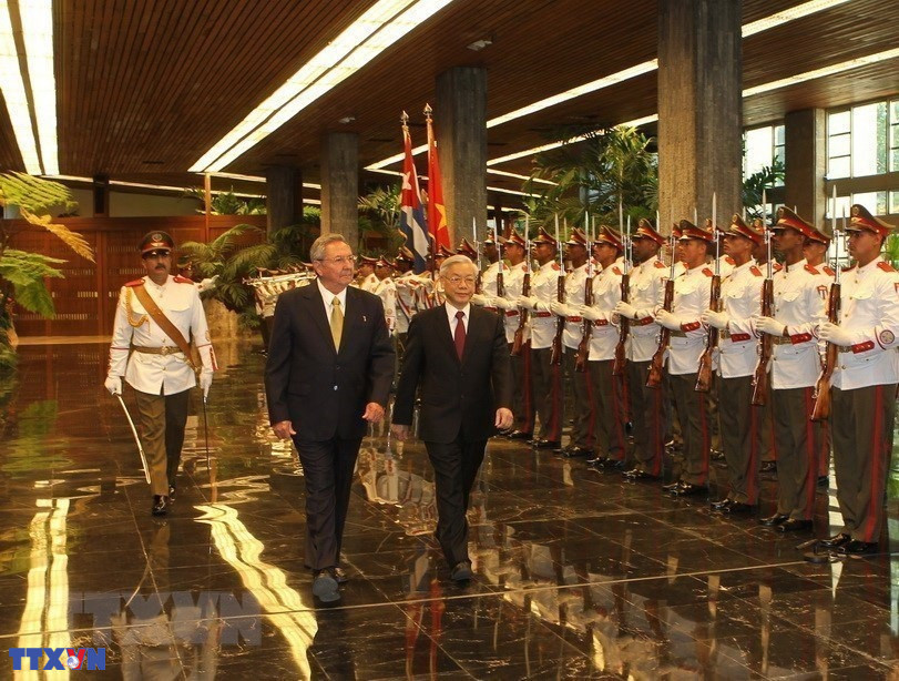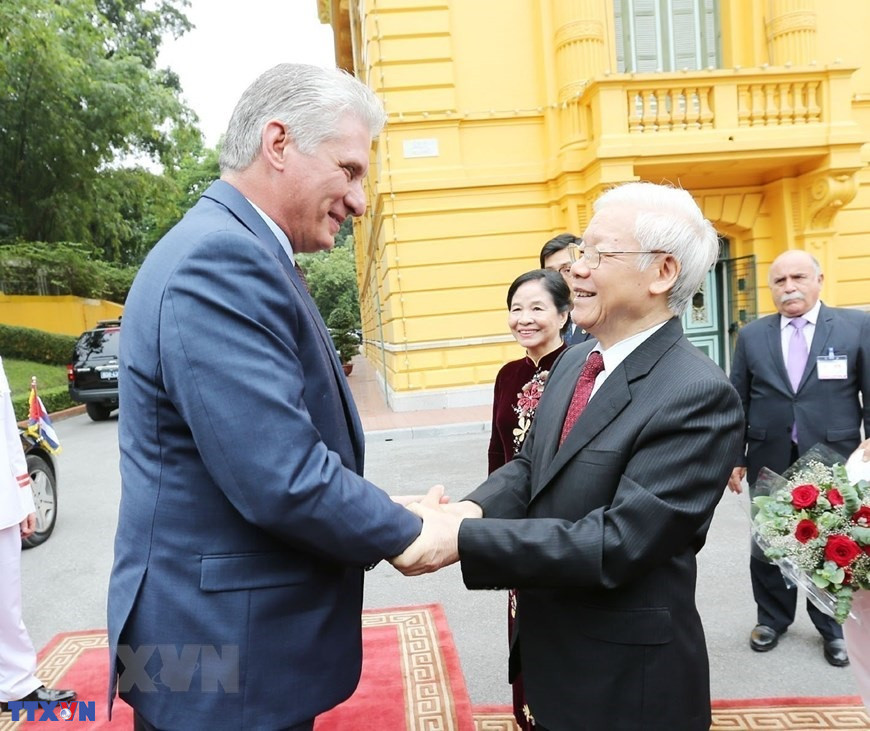 Tổng Bí thư, Chủ tịch nước Nguyễn Phú Trọng chủ trì lễ đón ông Miguel Mario Díaz-Canel Bermúdez. Đây là chuyến thăm Việt Nam đầu tiên trên cương vị Chủ tịch HĐNN và HĐBT Cuba của ông Miguel Mario Díaz-Canel Bermúdez (9/11/2018). (Ảnh: Trí Dũng/TTXVN)