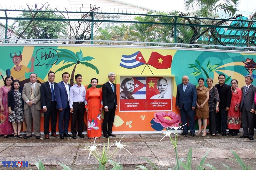 Lễ khánh thành công trình tranh vẽ cổ động về tình hữu nghị nhân dân Việt Nam – Cuba. Bức tranh được vẽ dọc bờ tường phía trước của Tổng Lãnh sự quán Cuba tại Thành phố Hồ Chí Minh (18/5/2022). (Ảnh: Tiến Lực/TTXVN)