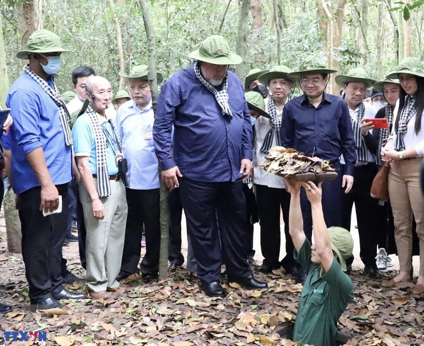 Thủ tướng Cuba Manuel Marrero Cruz xem tái hiện lại quá trình chiến đấu của bộ đội Việt Nam tại địa đạo Củ Chi, xã Phú Mỹ Hưng, huyện Củ Chi, Tp. Hồ Chí Minh (2022). (Ảnh: Hồng Giang/TTXVN)