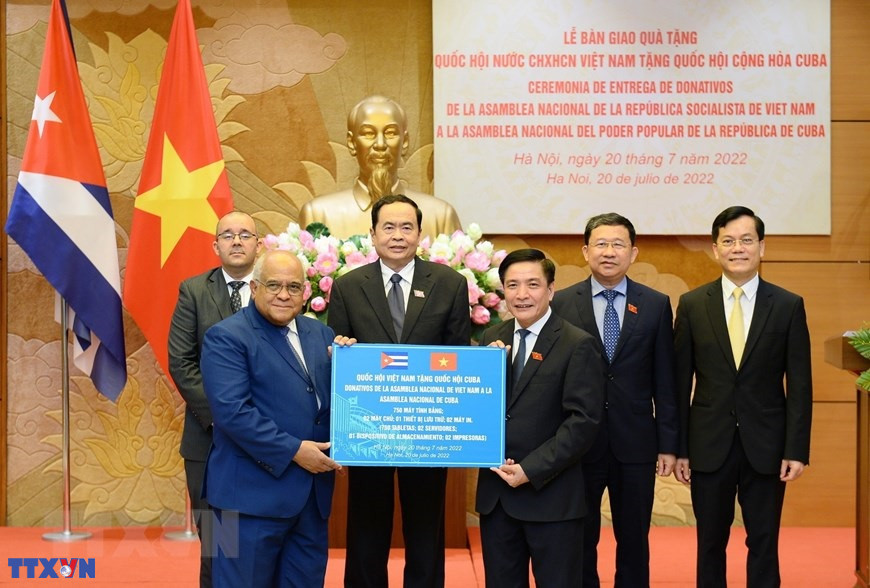 Tổng Thư ký Quốc hội kiêm Chủ nhiệm Văn phòng Quốc hội Bùi Văn Cường trao bảng tượng trưng cho Đại sứ đặc mệnh toàn quyền Cộng hòa Cuba tại Việt Nam Orlando Nicolás Hernández (2022). (Ảnh: Minh Đức/TTXVN)