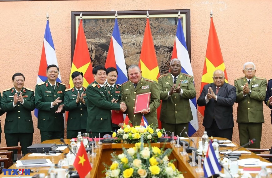 Đại tướng Lương Cường, Chủ nhiệm Tổng cục Chính trị QĐND Việt Nam và Trung tướng Vicstor Rojo Ramos, Chủ nhiệm Chính trị các Lực lượng vũ trang Cách mạng Cuba ký Biên bản ghi nhớ hợp tác giữa quân đội hai nước (2022). (Ảnh: Trọng Đức /TTXVN)