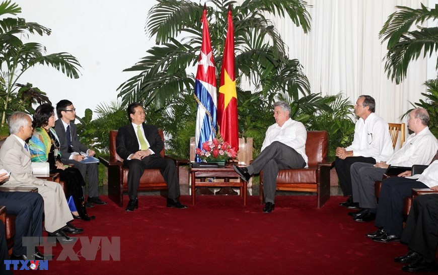 Trong chuyến thăm chính thức Cuba, ngày 26/3/2014, tại Cung Cách mạng ở thủ đô La Habana, Thủ tướng Nguyễn Tấn Dũng làm việc với đồng chí Miguel Díaz-Canel Bermúdez, Phó Chủ tịch thứ nhất Hội đồng Nhà nước và Hội đồng Bộ trưởng Cuba. (Ảnh: Đức Tám/TTXVN)