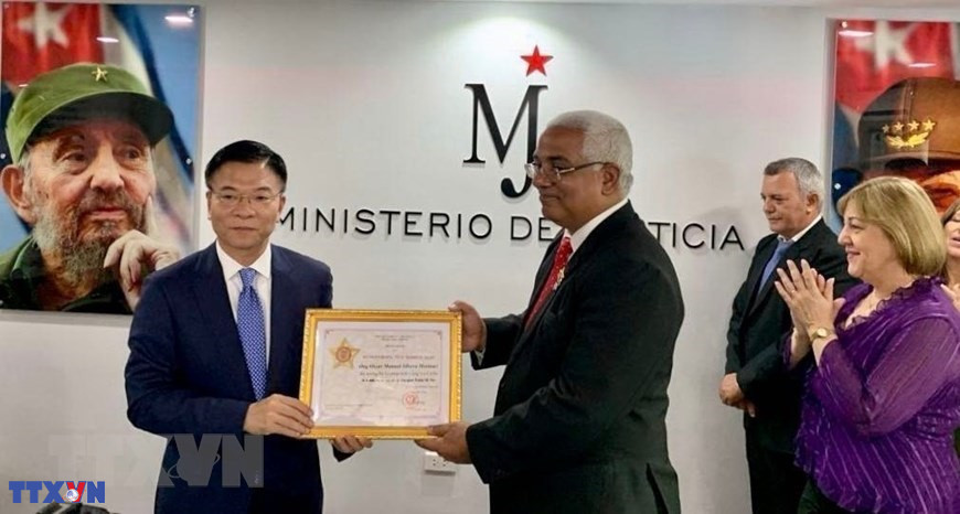 Bộ trưởng Lê Thành Long trao tặng Kỷ niệm chương "Vì sự nghiệp tư pháp” cho Bộ trưởng Tư pháp Cuba Oscar Manuel Silvera Martínez. (Ảnh: Mai Phương/TTXVN)