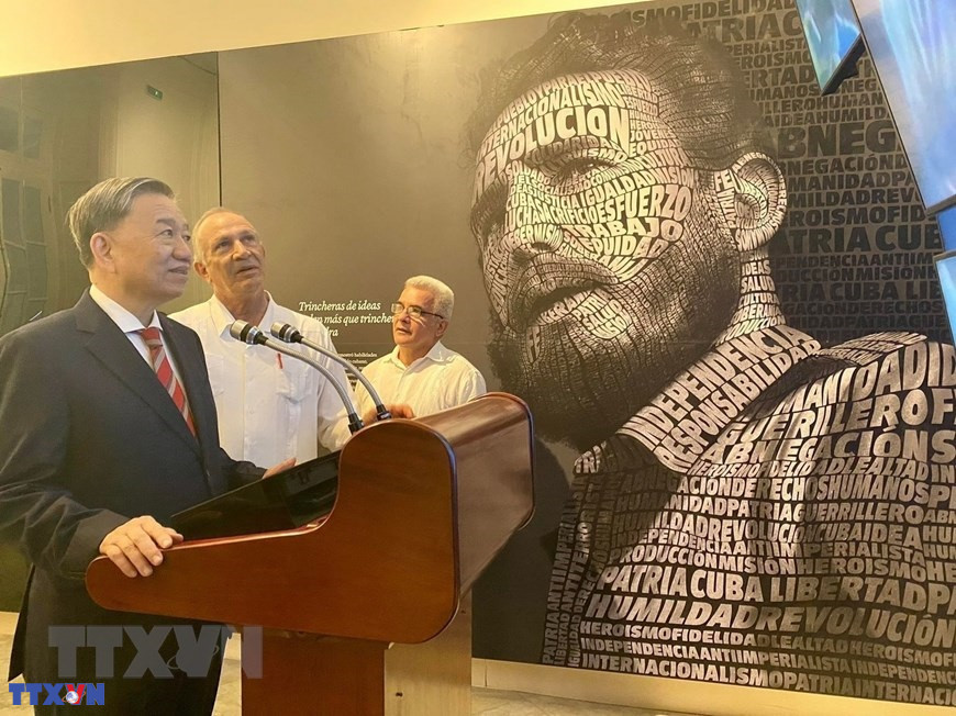Bộ trưởng Công an Tô Lâm thăm Trung tâm Fidel Castro ở Thủ đô La Habana trong chuyến thăm chính thức Cuba. (Ảnh: Mai Phương/TTXVN)