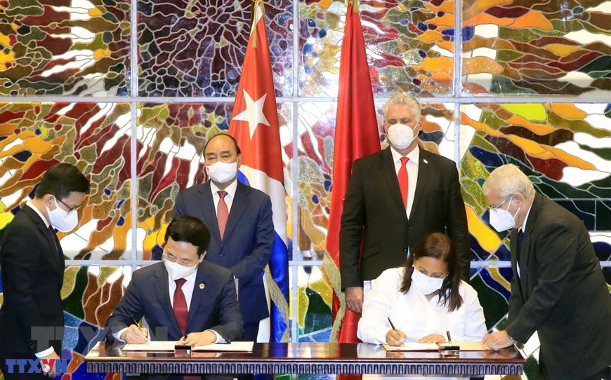 Chủ tịch nước Nguyễn Xuân Phúc và Bí thư thứ nhất Ban Chấp hành Trung ương Đảng Cộng sản Cuba, Chủ tịch nước Cộng hòa Cuba Miguel Díaz-Canel chứng kiến Lễ ký kết các văn kiện hợp tác giữa hai nước (19/9/2021). (Ảnh: Thống Nhất/TTXVN)