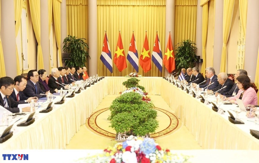 Tổng Bí thư, Chủ tịch nước Nguyễn Phú Trọng hội đàm với ông Miguel Mario Díaz-Canel Bermúdez, Chủ tịch Hội đồng Nhà nước và Hội đồng Bộ trưởng Cuba thăm hữu nghị chính thức Việt Nam từ ngày 8-10/11/2018. (Ảnh: Trí Dũng/TTXVN)