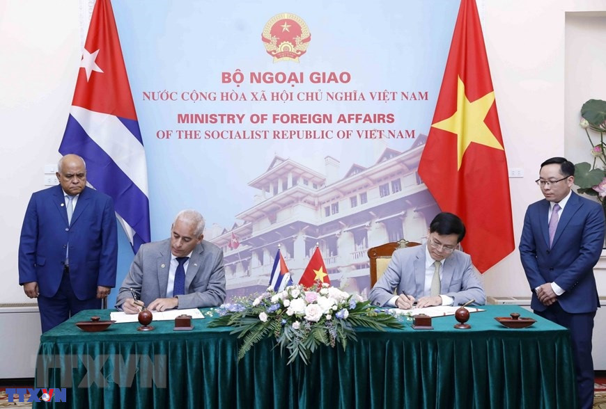 Thứ trưởng Bộ Ngoại giao Việt Nam Hà Kim Ngọc (phải) và Thứ trưởng thứ Nhất Bộ Ngoại giao Cuba Gerardo Penalver Portal ký kết Kế hoạch Tham khảo chính trị giữa Bộ Ngoại giao 2 nước giai đoạn 2023-2025 tại Phiên tham khảo Chính trị cấp Thứ trưởng Ngoại giao Việt Nam-Cuba lần thứ VII. (Ảnh: An Đăng/TTXVN)
