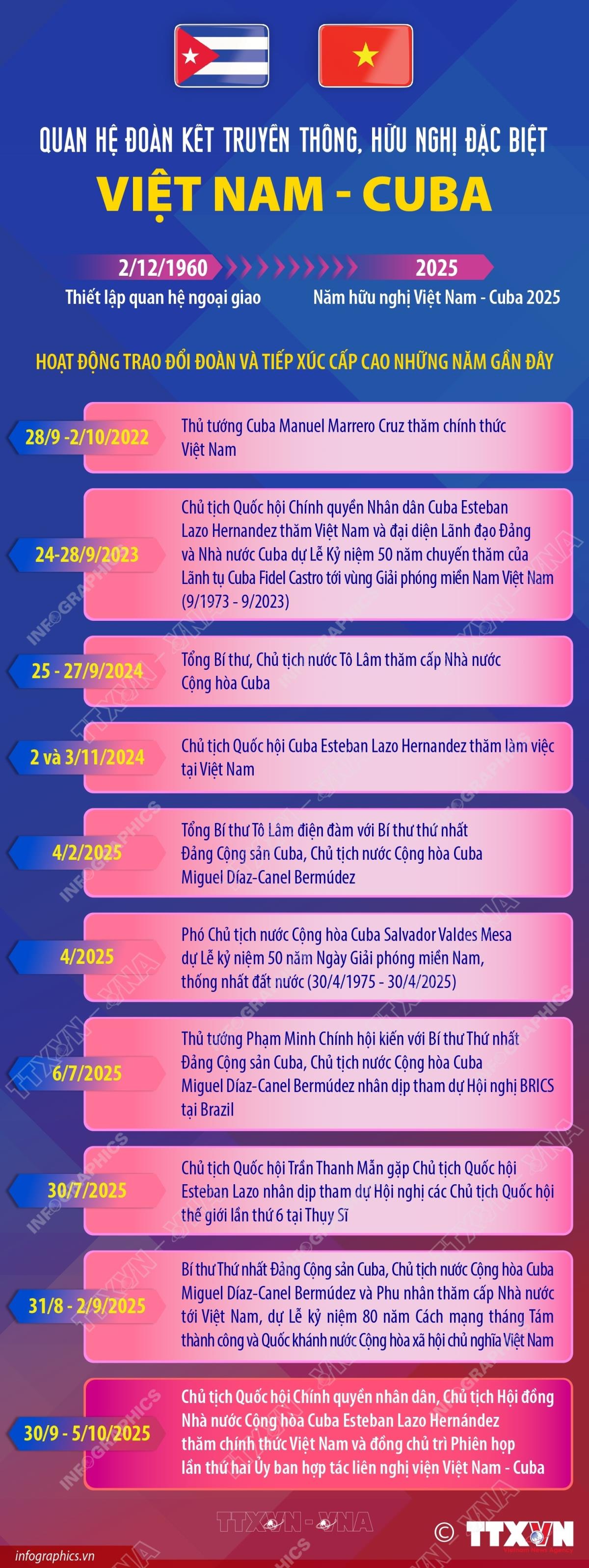 Nhận lời mời của Chủ tịch Quốc hội nước Cộng hòa xã hội chủ nghĩa Việt Nam Trần Thanh Mẫn, Chủ tịch Quốc hội Chính quyền nhân dân, Chủ tịch Hội đồng Nhà nước Cộng hòa Cuba Esteban Lazo Hernández thăm chính thức Việt Nam và đồng chủ trì Phiên họp lần thứ hai Ủy ban hợp tác liên nghị viện Việt Nam - Cuba từ ngày 30/9 - 5/10/2025. Đây là lần thứ 5 đồng chí Esteban Lazo Hernández có chuyến thăm tới Việt Nam trên cương vị Chủ tịch Quốc hội Cuba. Chuyến thăm lần này góp phần thắt chặt hơn quan hệ đoàn kết truyền thống, hữu nghị đặc biệt Việt Nam-Cuba, vốn luôn được Đảng, Nhà nước và Nhân dân hai nước hết sức coi trọng, không ngừng vun đắp và phát triển trên tất cả các kênh, trong đó có kênh Nghị viện.