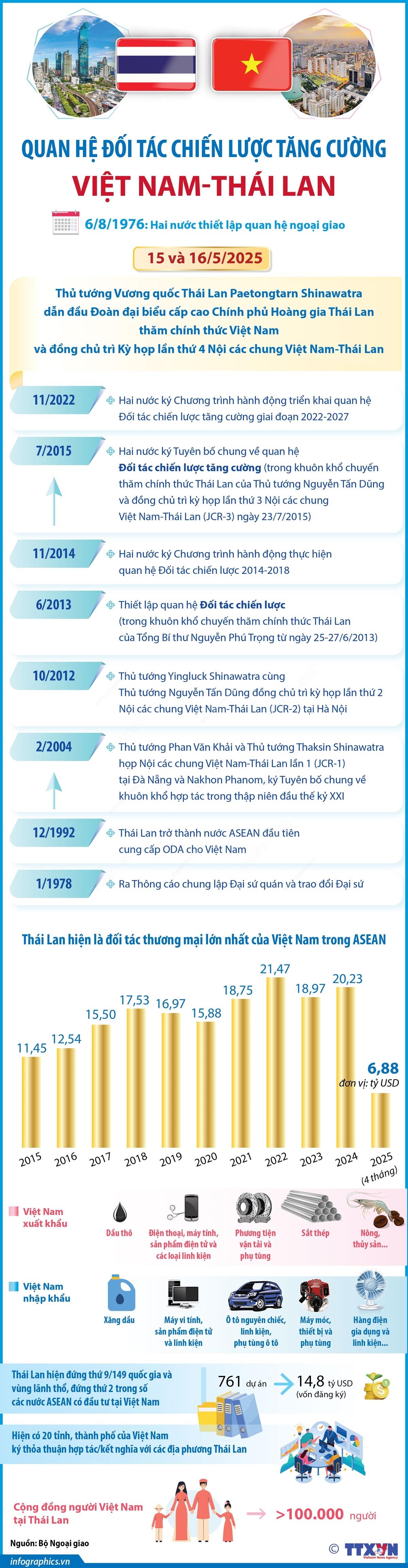 Hà Nội (TTXVN 15/5/2025)) Nhận lời mời của Thủ tướng Chính phủ Phạm Minh Chính, Thủ tướng Vương quốc Thái Lan Paetongtarn Shinawatra dẫn đầu Đoàn đại biểu cấp cao Chính phủ Hoàng gia Thái Lan thăm chính thức Việt Nam và đồng chủ trì Kỳ họp lần thứ 4 Nội các chung Việt Nam-Thái Lan vào ngày 15 và 16/5/2025.