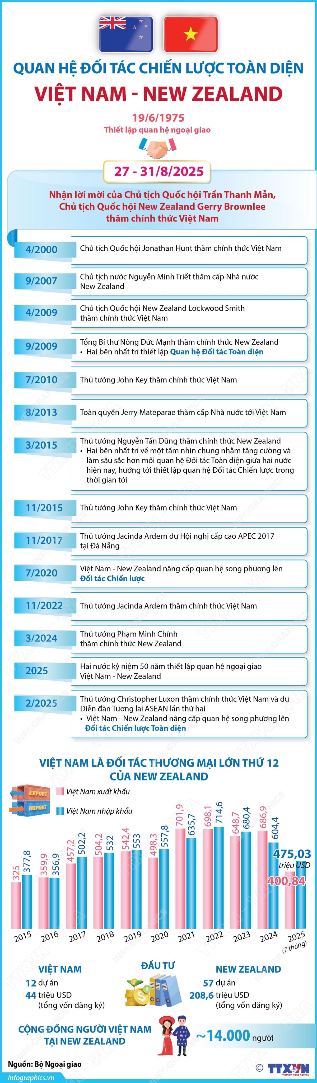 Hà Nội (TTXVN 27/8/2025) Nhận lời mời của Chủ tịch Quốc hội Trần Thanh Mẫn, Chủ tịch Quốc hội New Zealand Gerry Brownlee thăm chính thức Việt Nam từ ngày 27 đến 31/8/2025. Đây là chuyến thăm đầu tiên của Chủ tịch Quốc hội New Zealand Gerry Brownlee kể từ khi ông nhậm chức, diễn ra trong bối cảnh năm 2025, hai nước kỷ niệm 50 năm ngày thiết lập quan hệ ngoại giao (19/6/1975-19/6/2025) với nhiều hoạt động ý nghĩa. Chuyến thăm sẽ góp phần củng cố tin cậy chính trị, làm sâu sắc hơn quan hệ Đối tác chiến lược toàn diện, đưa quan hệ song phương Việt Nam-New Zealand đi vào thực chất, hiệu quả hơn.