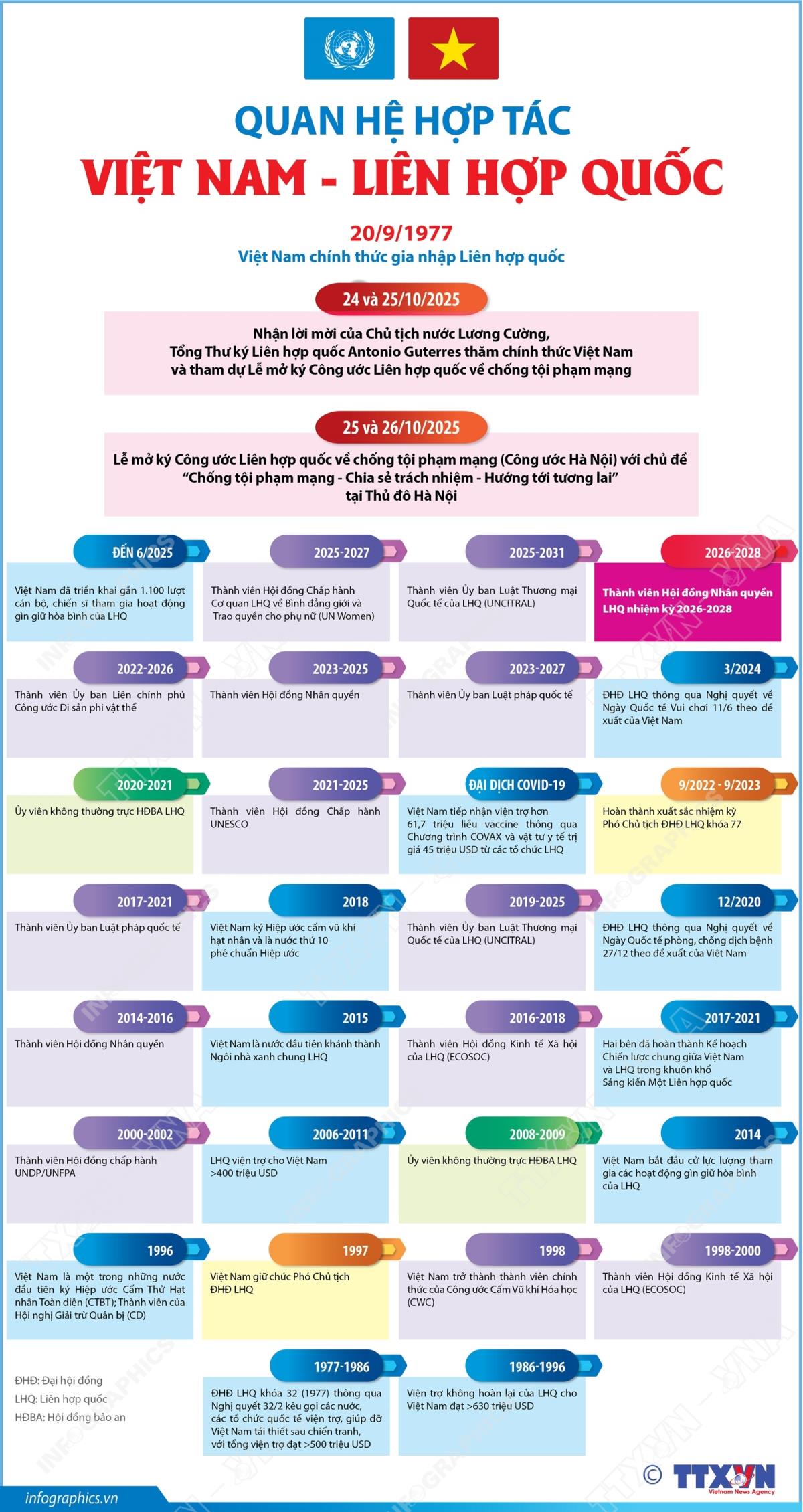 Hà Nội (TTXVN 24/10/2025) Nhận lời mời của Chủ tịch nước Lương Cường, Tổng Thư ký António Guterres thăm chính thức Việt Nam và tham dự Lễ mở ký Công ước Liên hợp quốc về chống tội phạm mạng ngày 24 và 25/10/2025.