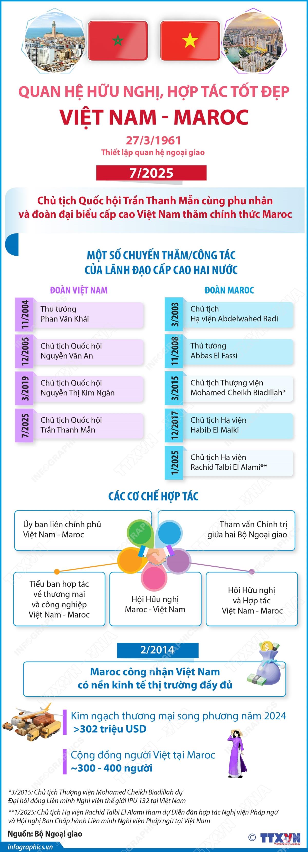 Hà Nội (TTXVN 24/7/2025) Nhận lời mời của Chủ tịch Hạ viện Vương quốc Maroc Rachid Talbi Alami, Chủ tịch Quốc hội Trần Thanh Mẫn cùng Phu nhân và đoàn đại biểu cấp cao Việt Nam thăm chính thức Vương quốc Maroc (Ma-rốc) sau chuyến thăm chính thức Cộng hòa Senegal. Đây là chuyến thăm chính thức đầu tiên của lãnh đạo chủ chốt Việt Nam tới Maroc sau 6 năm, diễn ra vào thời điểm hai nước đang chuẩn bị cho các hoạt động kỷ niệm 65 năm thiết lập quan hệ ngoại giao vào năm 2026 (27/3/1961-27/3/2026). Chuyến thăm góp phần củng cố và tăng cường hơn nữa quan hệ hữu nghị, hợp tác tốt đẹp cùng có lợi giữa Việt Nam với Maroc.
