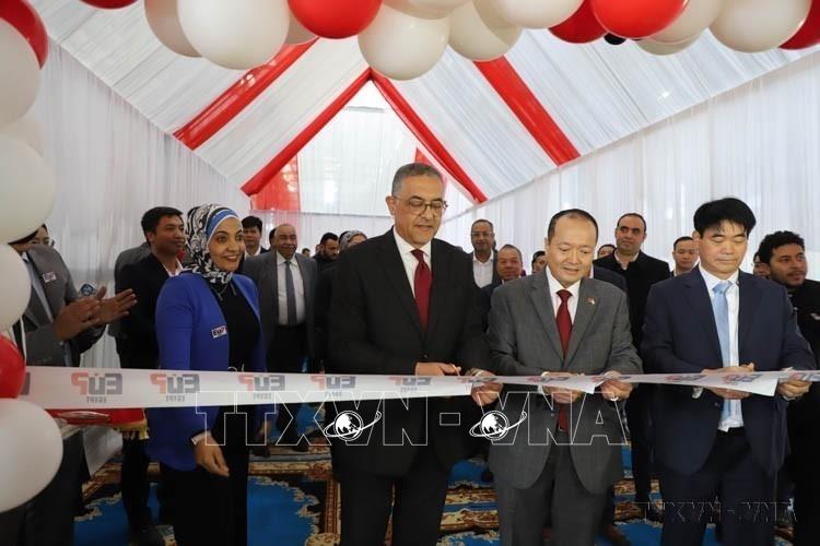 Đại sứ Việt Nam tại Ai Cập Nguyễn Huy Dũng và Chủ tịch Cơ quan Quản lý Đầu tư và Các khu chế suất Ai Cập Hossam Heiba cắt băng khánh thành Nhà máy EuP Egypt. Đây là nhà máy đầu tiên của một doanh nghiệp Việt Nam tại Ai Cập (Sadat, 15/1/2024). Ảnh: Nguyễn Trường - TTXVN