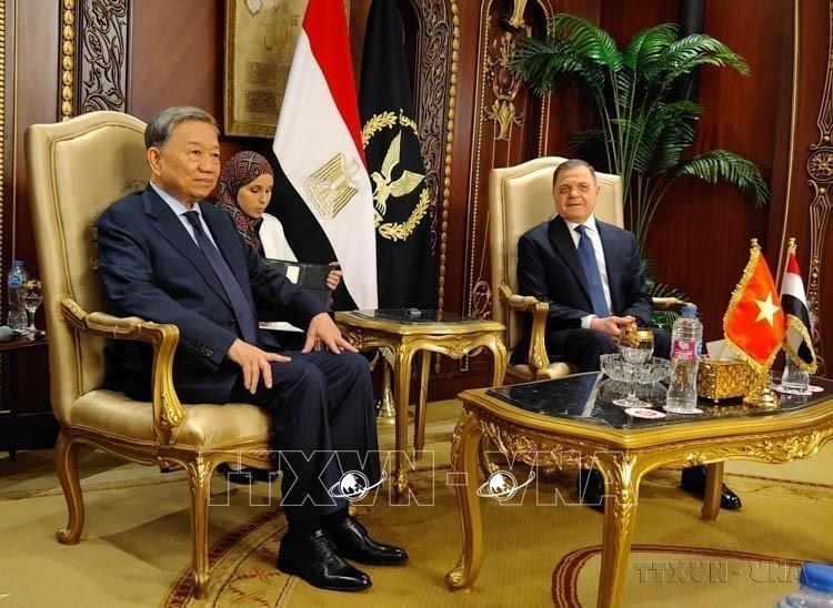 Đại tướng Tô Lâm, Bộ trưởng Bộ Công an hội kiến Chủ tịch Thượng viện Ai Cập, Chủ tịch Đảng Tương lai Quốc gia của Ai Cập Abdel-Wahab Abdel-Razek (Cairo, 05/12/2023). Ảnh: Nguyễn Trường - TTXVN