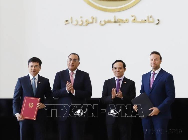 Phó Thủ tướng Trần Lưu Quang và Thủ tướng Ai Cập Mostafa Madbouly chứng kiến lễ ký Bản ghi nhớ về hợp tác giữa Ngân hàng Nhà nước Việt Nam và Ngân hàng Trung ương Ai Cập (Cairo, 27/7/2023). Ảnh: Nguyễn Trường - TTXVN