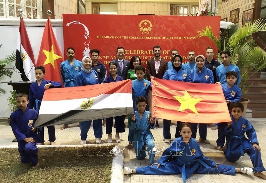 Đại sứ Việt Nam tại Ai Cập Trần Thành Công và phu nhân chụp ảnh cùng CLB Vovinam tại Ai Cập trong Lễ kỷ niệm 74 năm Ngày Quốc khánh Việt Nam (Cairo, 12/9/2019). Ảnh: Việt Khoa - TTXVN
