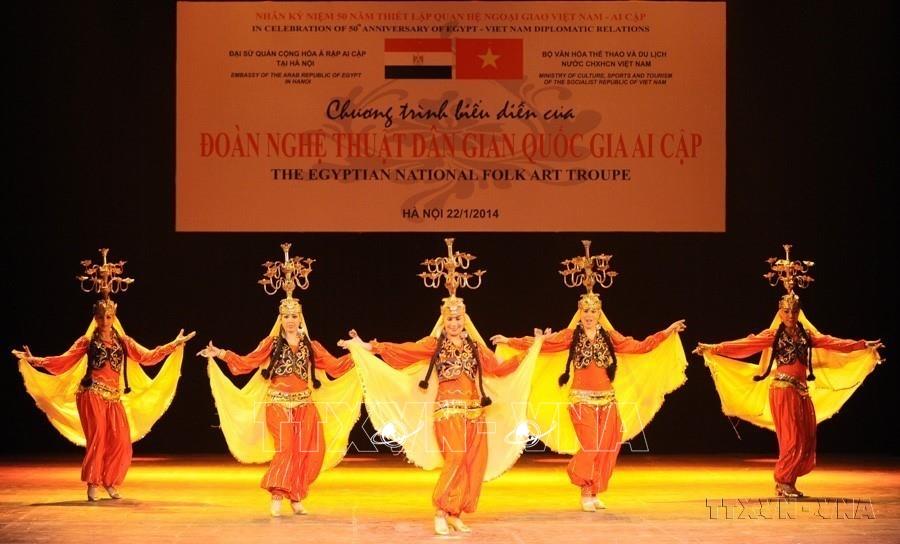 Các nghệ sĩ Ai Cập biểu diễn múa truyền thống tại chương trình nghệ thuật đặc sắc do Đoàn Nghệ thuật Dân gian Quốc gia Ai Cập biểu diễn tại Nhà hát Lớn (Hà Nội, 22/1/2014). Ảnh: Minh Đức - TTXVN