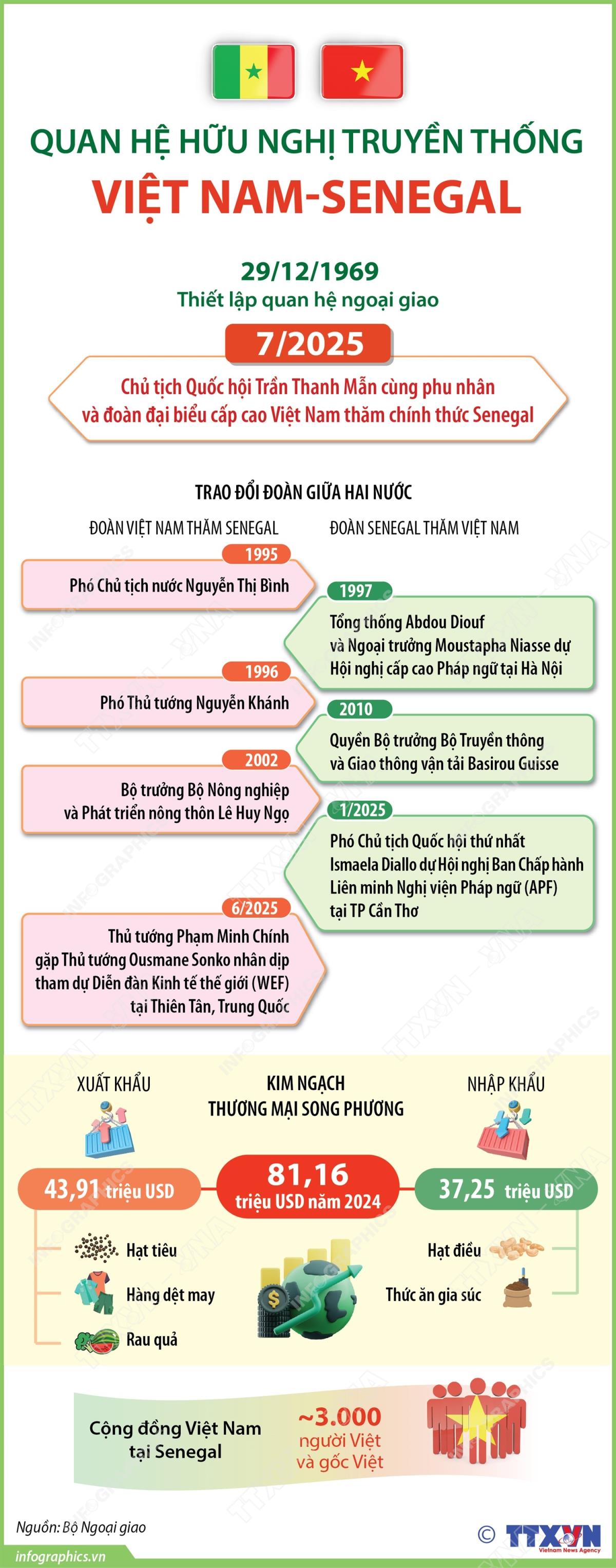Trong đó, Senegal là chặng dừng chân đầu tiên của Chủ tịch Quốc hội Trần Thanh Mẫn và Phu nhân cùng đoàn đại biểu cấp cao Việt Nam (từ ngày 22 đến 24/7/2025). Đây là chuyến thăm cấp cao nhất từ trước đến nay trong hơn 55 năm quan hệ giữa hai nước. Vì vậy, chuyến thăm được kỳ vọng đánh dấu một bước ngoặt mở ra những triển vọng hợp tác mới giữa hai nước.