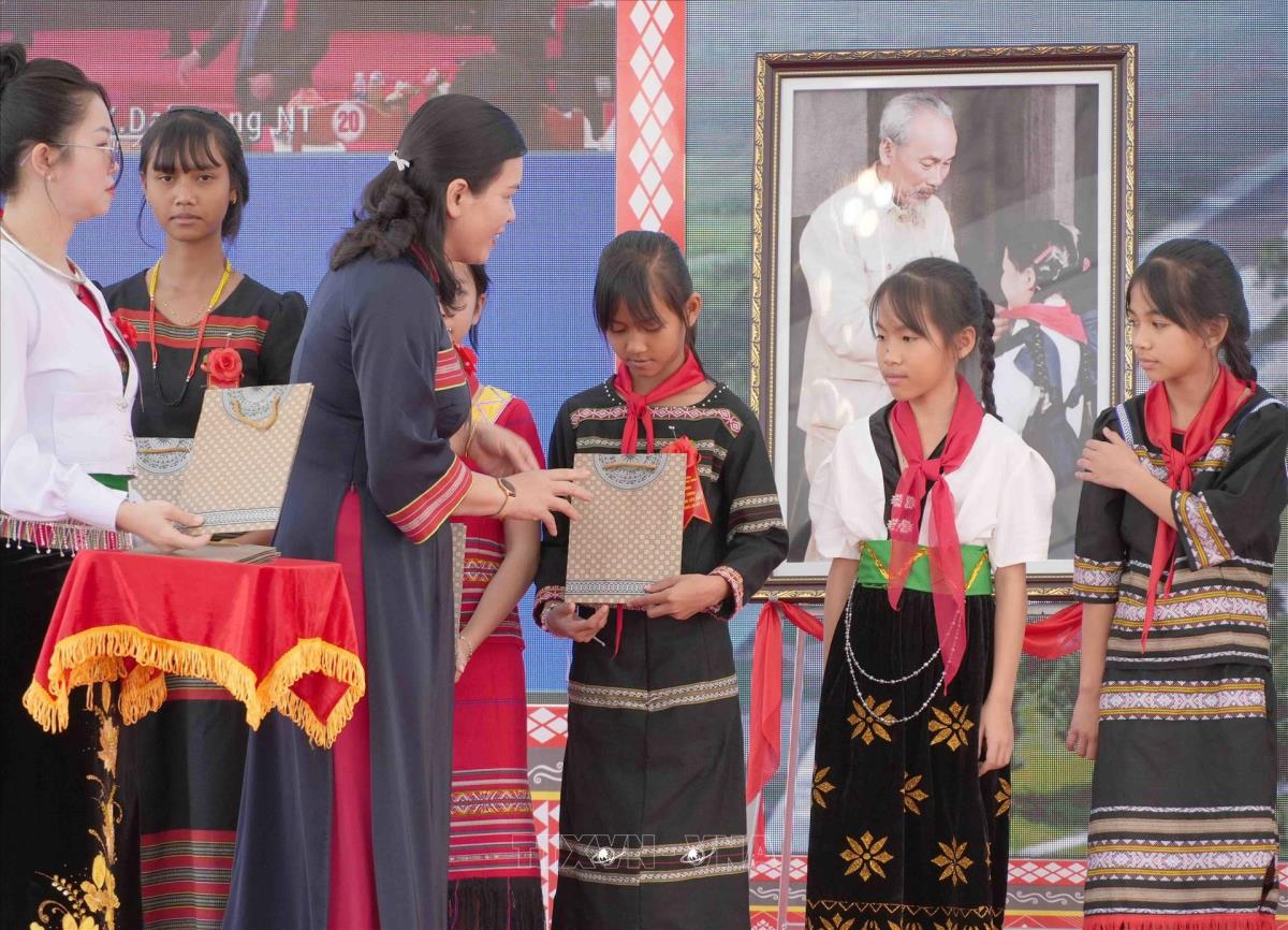 Lãnh đạo tỉnh Quảng Ngãi tặng quà cho học sinh tại Lễ khởi công điểm cầu chính Trường Phổ thông nội trú liên cấp Tiểu học - Trung học cơ sở xã Bờ Y (19/3/2026). Ảnh: Dư Toán - TTXVN