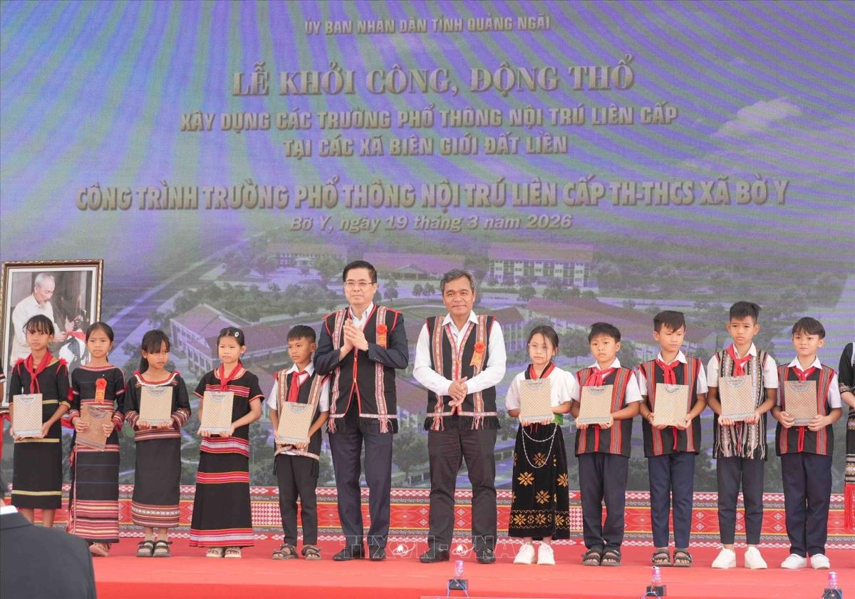 Lãnh đạo tỉnh Quảng Ngãi tặng quà học sinh tại Lễ khởi công điểm cầu chính Trường Phổ thông nội trú liên cấp Tiểu học - Trung học cơ sở xã Bờ Y (19/3/2026). Ảnh: Dư Toán - TTXVN