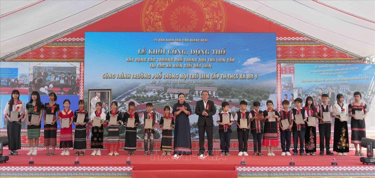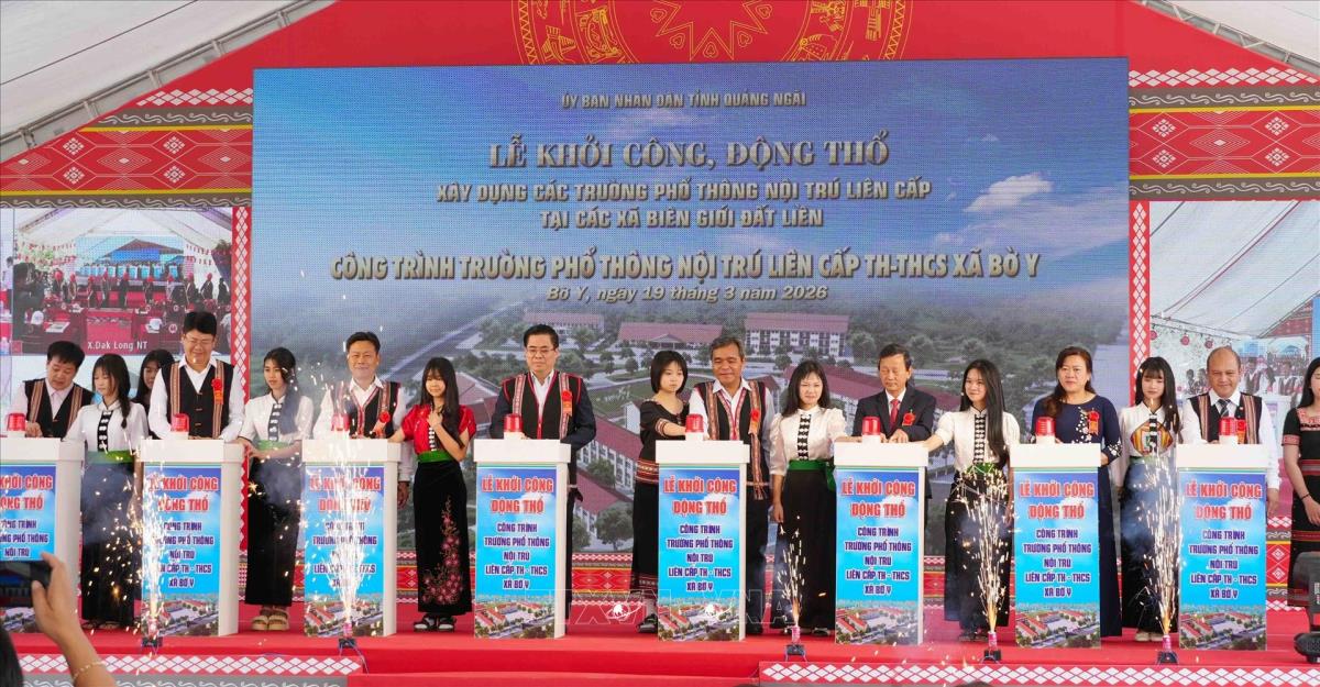 Quảng Ngãi (TTXVN 19/3/2026) Sáng 19/3/2026, cùng với cả nước, tỉnh Quảng Ngãi tổ chức khởi công 5 trường phổ thông nội trú liên cấp Tiểu học – Trung học cơ sở tại các xã Ia Đal, Ia Tơi, Bờ Y, Đăk Long và Đăk Plô, với tổng mức đầu tư trên 1.116 tỷ đồng.