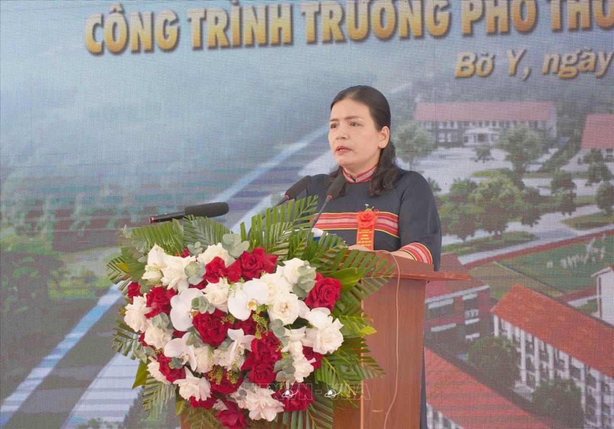Bà Y Ngọc, Phó Chủ tịch Thường trực UBND tỉnh Quảng Ngãi, phát biểu tại Lễ khởi công điểm cầu chính Trường Phổ thông nội trú liên cấp Tiểu học - Trung học cơ sở xã Bờ Y (19/3/2026). Ảnh: Dư Toán - TTXVN