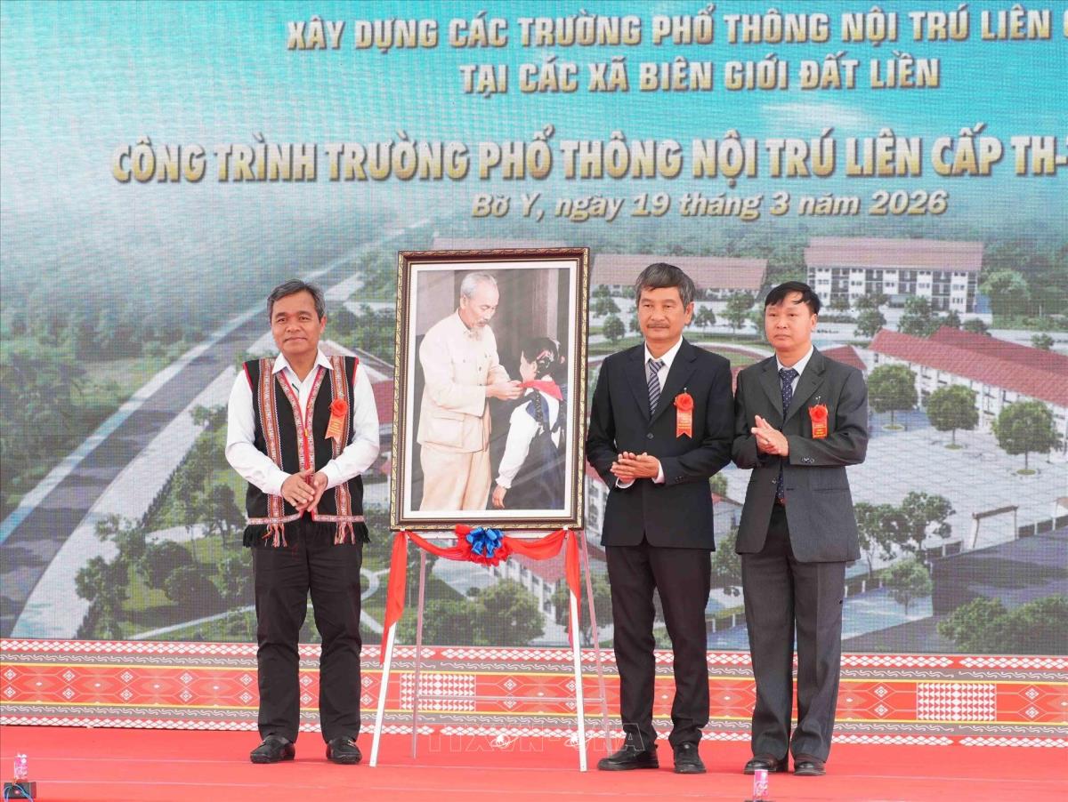 Nghi thức khởi công tại điểm cầu chính Trường Phổ thông nội trú liên cấp Tiểu học - Trung học cơ sở xã Bờ Y (19/3/2026). Ảnh: Dư Toán - TTXVN