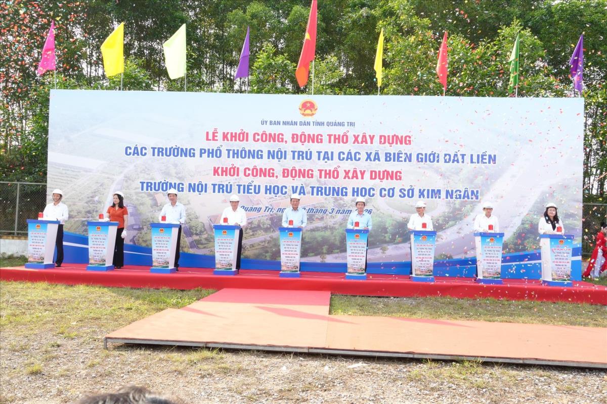 Các đại biểu thực hiện nghi thức khởi công dự án xây dựng Trường nội trú tiểu học và trung học cơ sở Kim Ngân (Quảng Trị) (19/3/2026). Ảnh: Tá Chuyên - TTXVN
