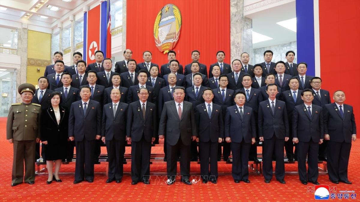 Nhà lãnh đạo Triều Tiên Kim Jong-un chụp ảnh cùng các thành viên nội các mới và các đại biểu Quốc hội khóa XV tại Bình Nhưỡng, ngày 23/3/2026. Ảnh: Yonhap/TTXVN