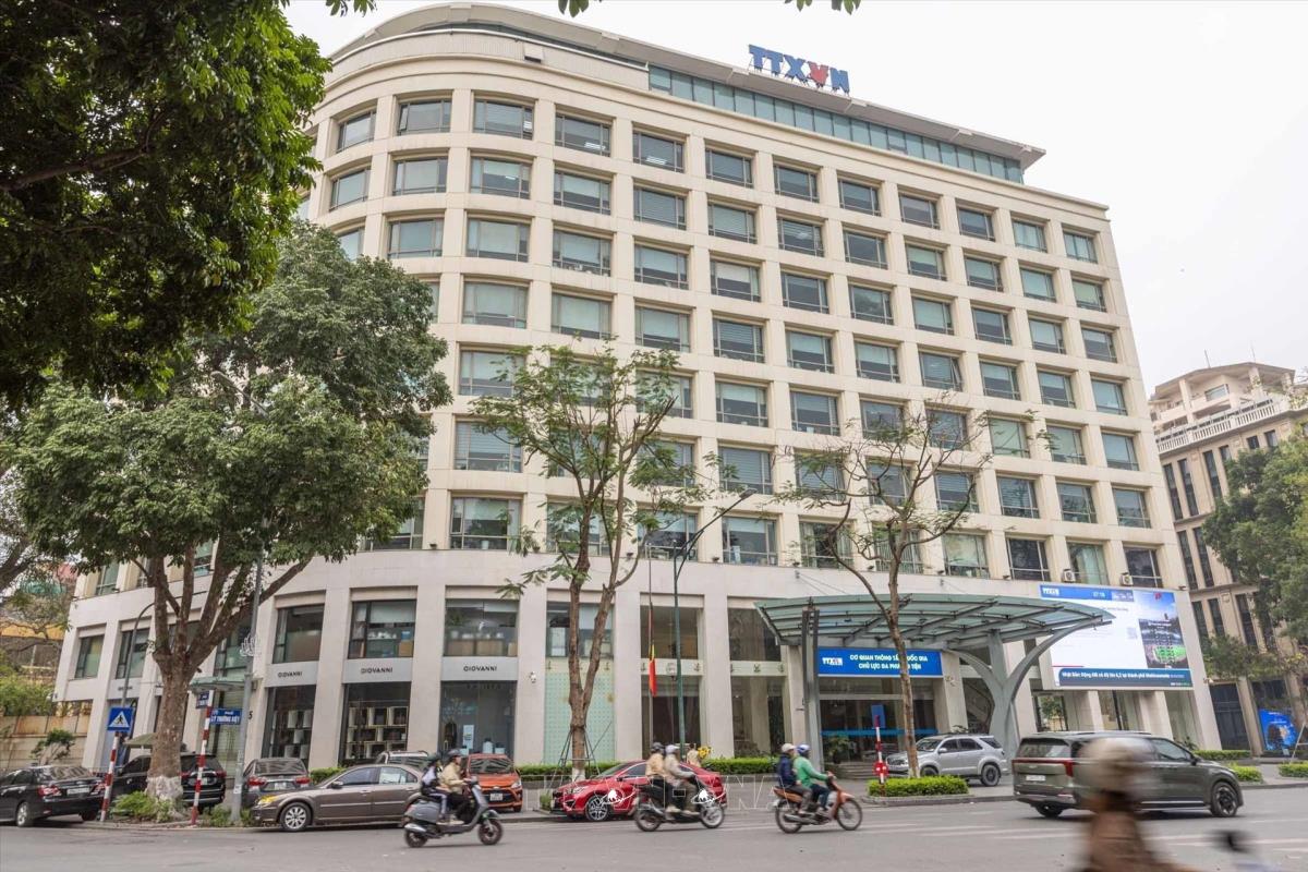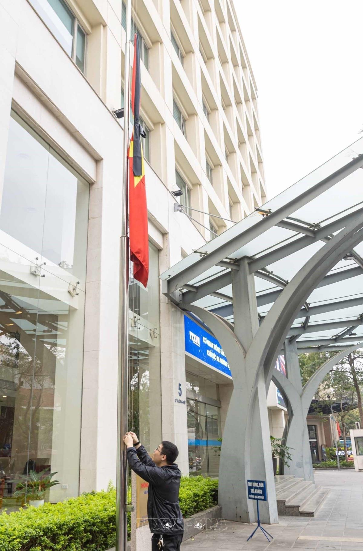 Treo Cờ rủ tại Trụ sở chính Thông tấn xã Việt Nam số 5 Lý Thường Kiệt, Hà Nội (4/4/2025). Ảnh: Hoàng Hiếu - TTXVN