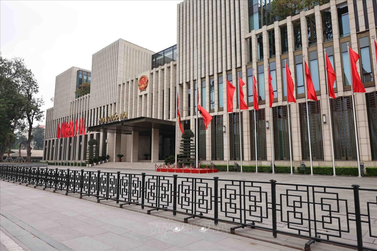 Treo cờ rủ tại Nhà Quốc hội (4/4/2025). Ảnh: Minh Đức – TTXVN