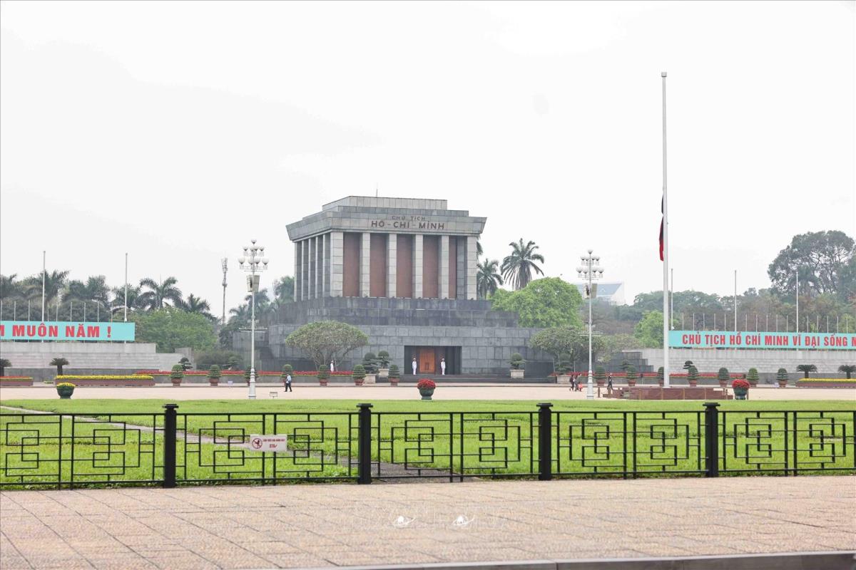 Treo cờ rủ tại Quảng trường Ba Đình (4/4/2025). Ảnh: Minh Đức – TTXVN