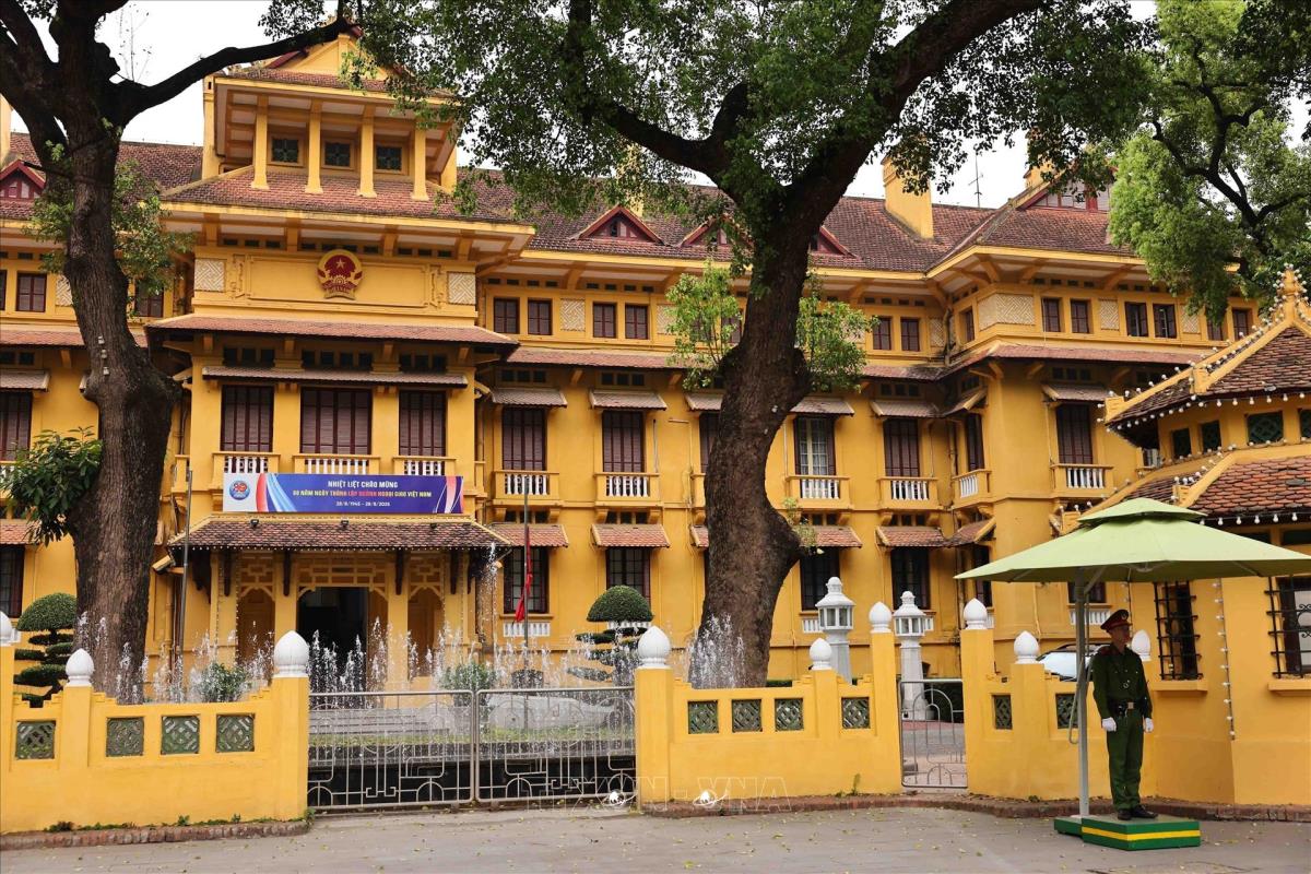 Treo cờ rủ tại Bộ Ngoại giao (4/4/2025). Ảnh: Minh Đức – TTXVN