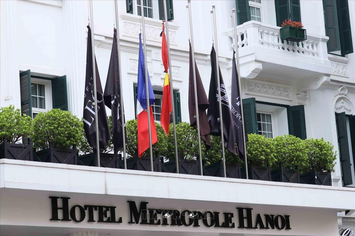 Treo cờ rủ tại khách sạn Metropole (Hà Nội) (4/4/2025). Ảnh: An Đăng - TTXVN