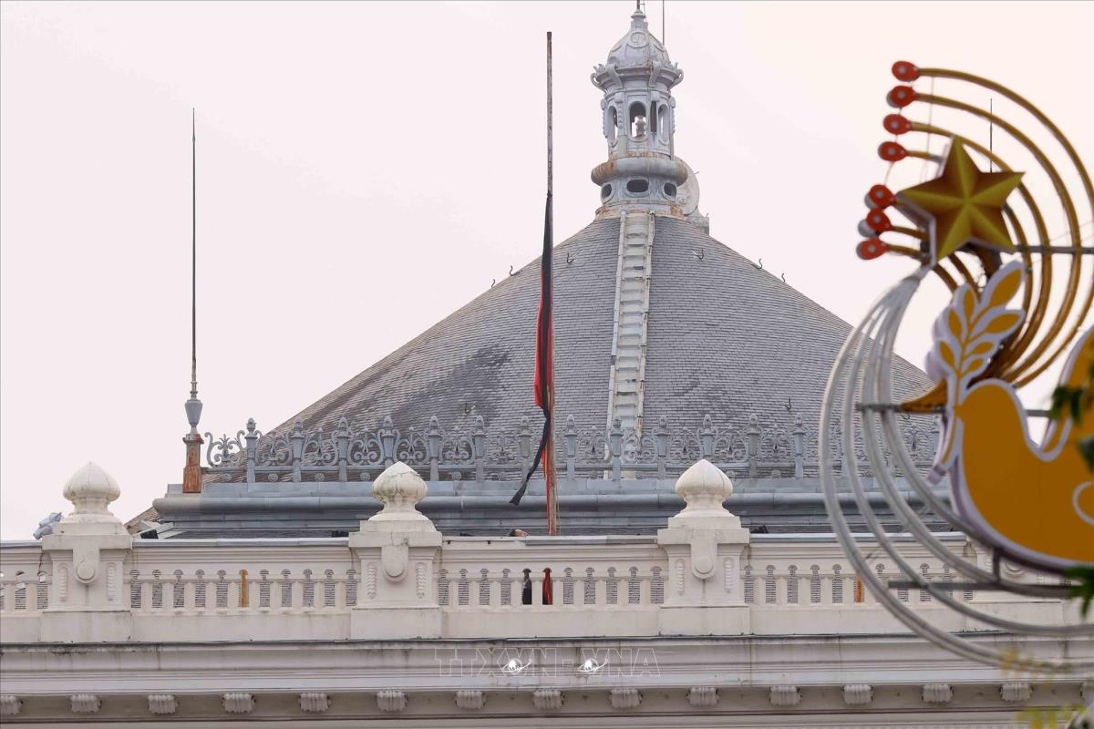 Treo Cờ rủ tại Nhà hát lớn (Hà Nội) (4/4/2025). Ảnh: An Đăng - TTXVN