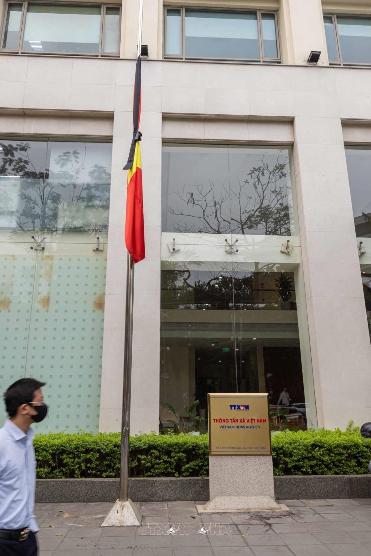 7h ngày 4/5/2025, cờ rủ được kéo lên tại Trụ sở Thông tấn xã Việt Nam (Hà Nội) (4/4/2025). Ảnh: Hoàng Hiếu - TTXVN