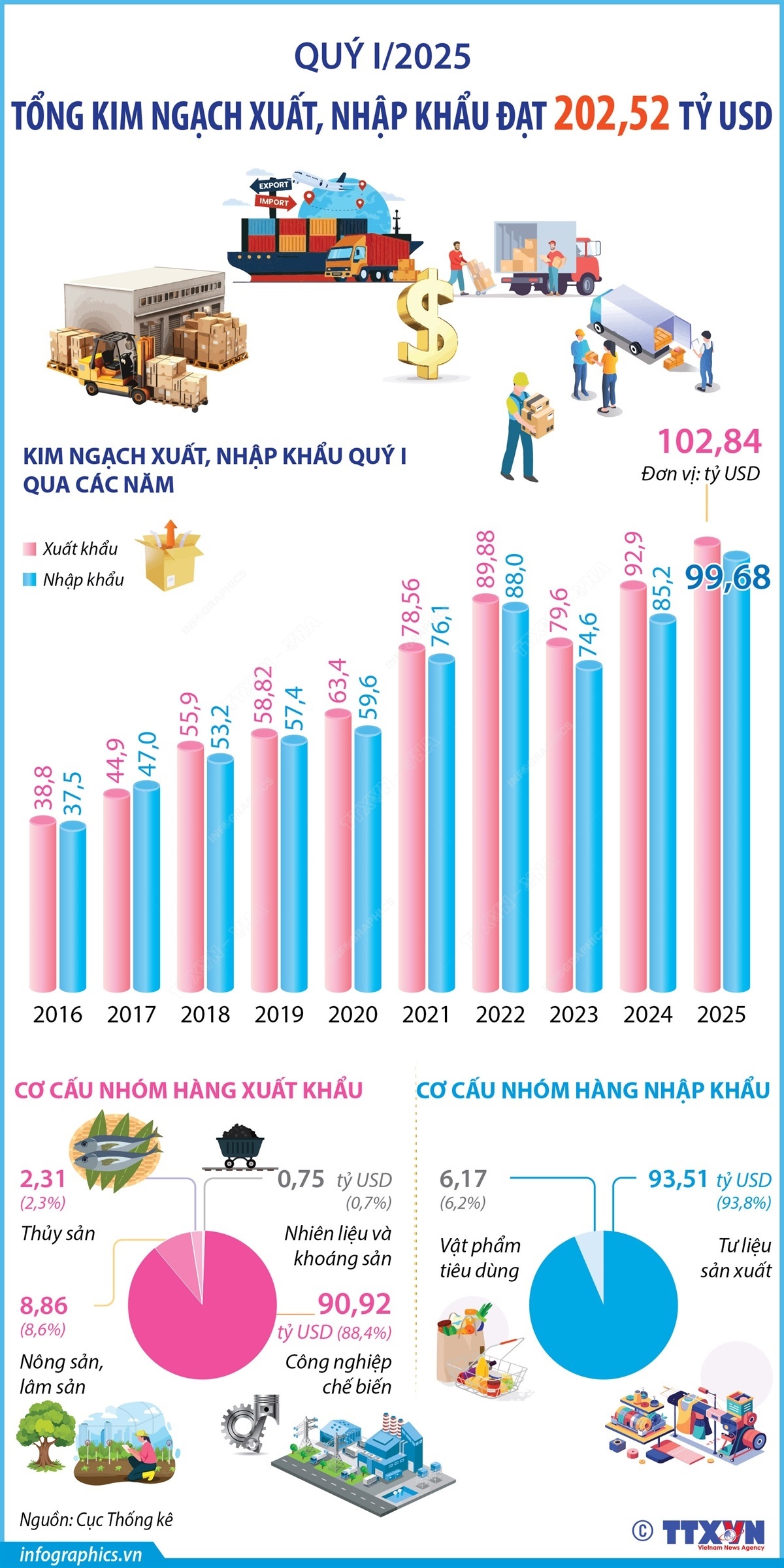 Tính chung quý I/2025, tổng kim ngạch xuất nhập khẩu hàng hóa đạt 202,52 tỉ USD, tăng 13,7% so với cùng kỳ năm trước; trong đó xuất khẩu tăng 10,6%; nhập khẩu tăng 17,0%. Cán cân thương mại hàng hóa xuất siêu 3,16 tỉ USD.