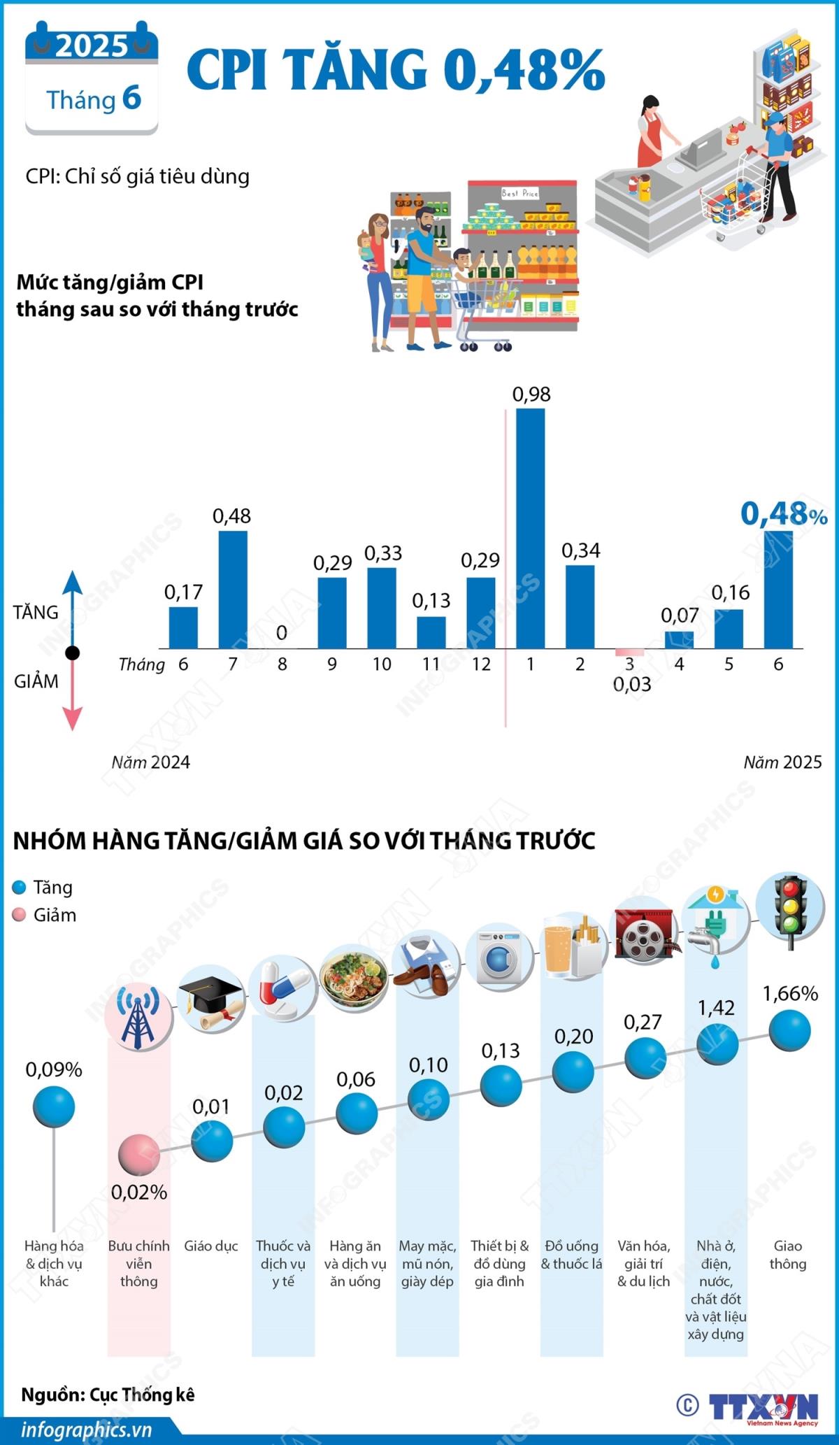 Hà Nội (TTXVN 5/7/2025) Phát biểu tại cuộc họp báo công bố số liệu thống kê kinh tế - xã hội quý II năm 2025, sáng 5/7, tại Hà Nội, Cục trưởng Cục Thống kê, Bộ Tài chính, bà Nguyễn Thị Hương cho biết, giá vật liệu bảo dưỡng nhà ở, đặc biệt là cát, đá, gạch tăng cao bất thường, xăng dầu tăng theo giá nhiên liệu thế giới là những nguyên nhân chính làm chỉ số giá tiêu dùng (CPI) tháng 6/2025 tăng 0,48% so với tháng trước; trong đó, khu vực thành thị tăng 0,5%; khu vực nông thôn tăng 0,45%. Trong 11 nhóm hàng hóa và dịch vụ tiêu dùng chính, có 10 nhóm hàng tăng giá và chỉ riêng nhóm bưu chính, viễn thông giảm giá.