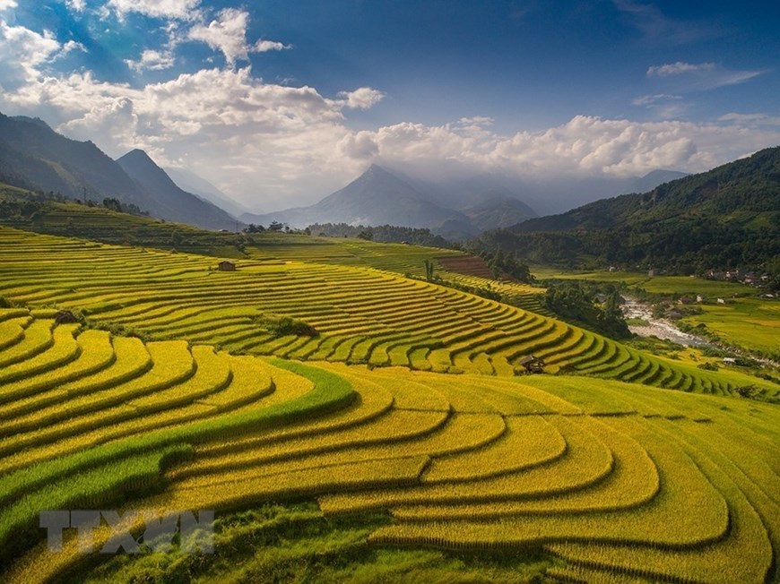 Ánh nắng chiếu qua làn mây rọi xuống các thửa ruộng càng tăng thêm vẻ đẹp của Sapa mùa vàng. (Ảnh: Quốc Khánh/TTXVN)