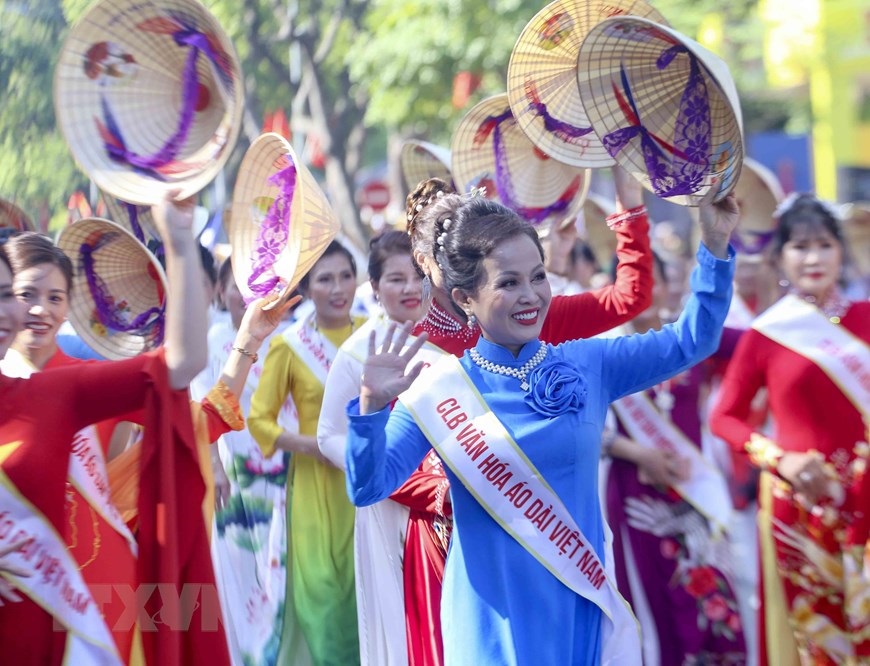 Đoàn diễu hành của Câu lạc bộ Văn hóa Áo dài Việt Nam. (Ảnh: Tuấn Đức/TTXVN)