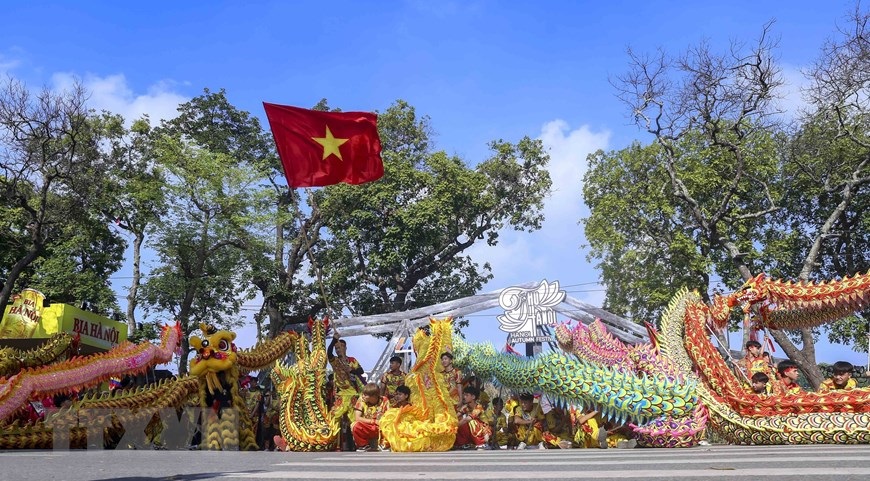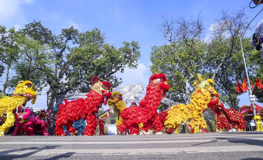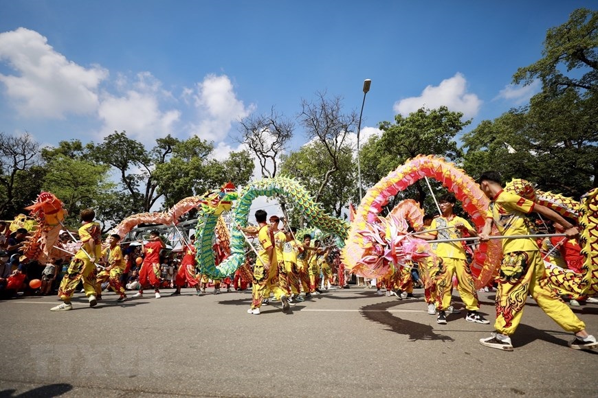 Tiết mục múa lân của huyện Thanh Oai, Hà Nội. (Ảnh: Tuấn Đức/TTXVN)