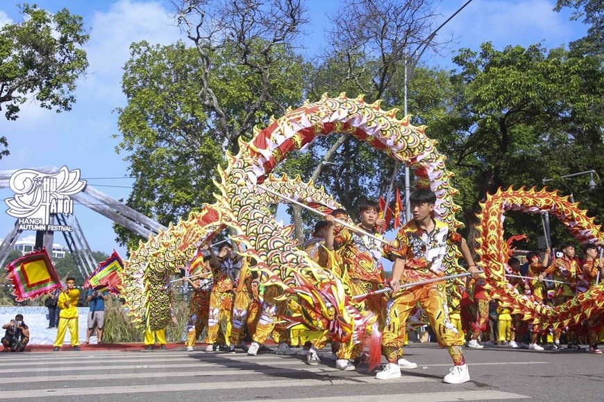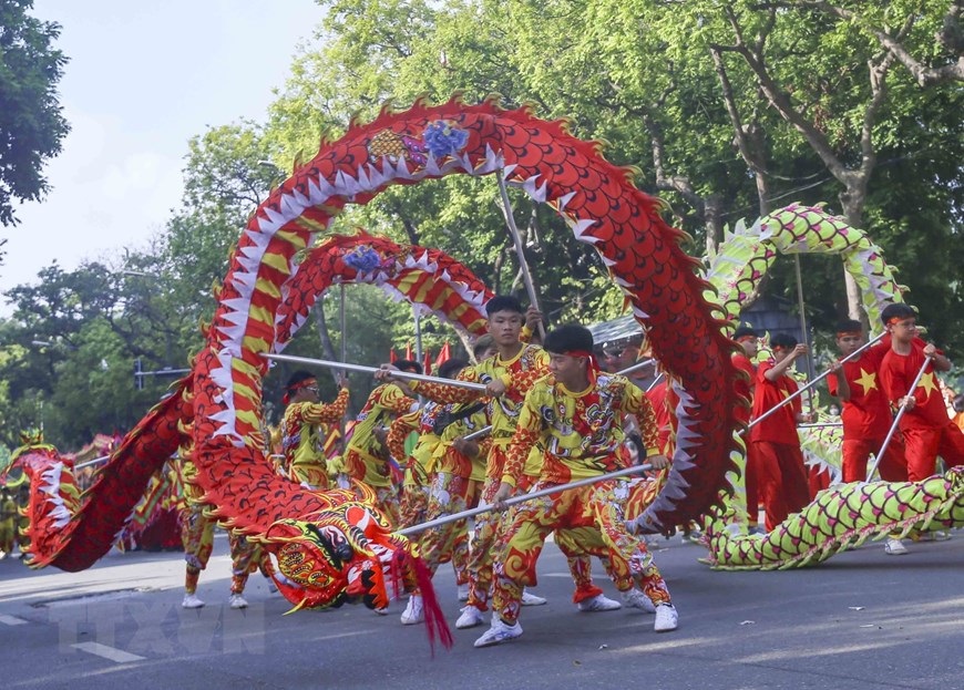 Tiết mục múa rồng của huyện Thanh Oai, Hà Nội. (Ảnh: Tuấn Đức/TTXVN)