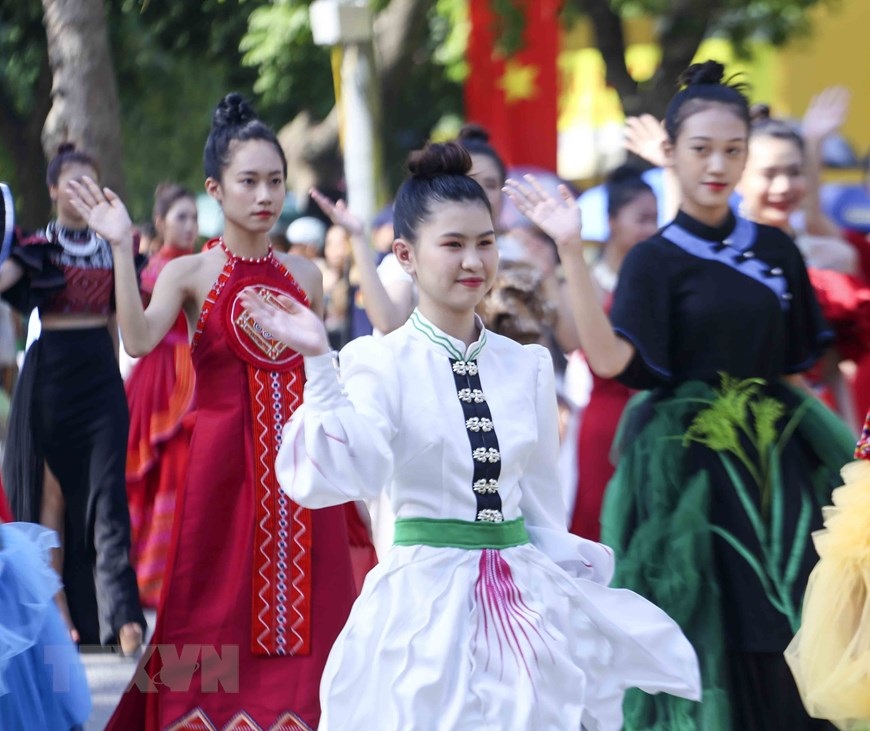 Đoàn diễu hành trang phục dân tộc cách điệu. (Ảnh: Tuấn Đức/TTXVN)