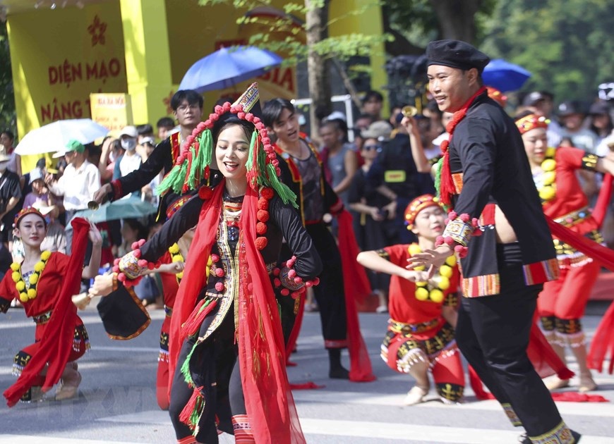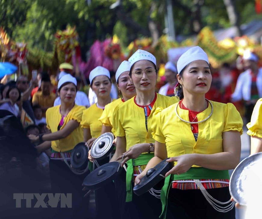 Đoàn diễu hành biểu diễn cồng chiêng, văn hóa đồng bào Mường. (Ảnh: Tuấn Đức/TTXVN)