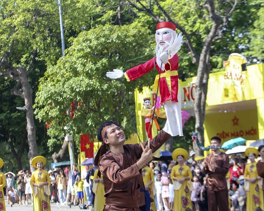 Đoàn diễu hành Rối cạn Tế Tiêu (huyện Mỹ Đức, Hà Nội). (Ảnh: Tuấn Đức/TTXVN)