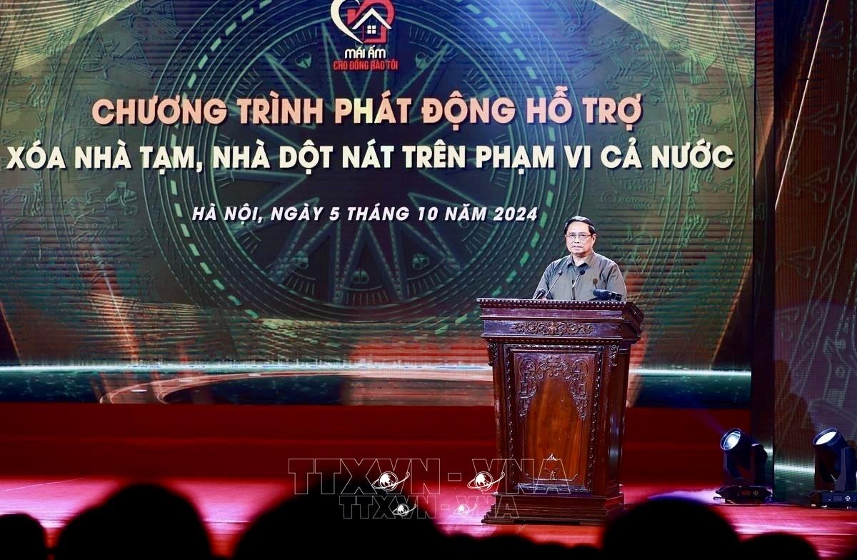 [Ảnh trên: Thủ tướng Phạm Minh Chính phát biểu tại Chương trình phát động hỗ trợ xóa nhà tạm, nhà dột nát trên phạm vi cả nước với chủ đề: “Mái ấm cho đồng bào tôi” (tối 5/10/2024). Ảnh: Dương Giang/TTXVN]