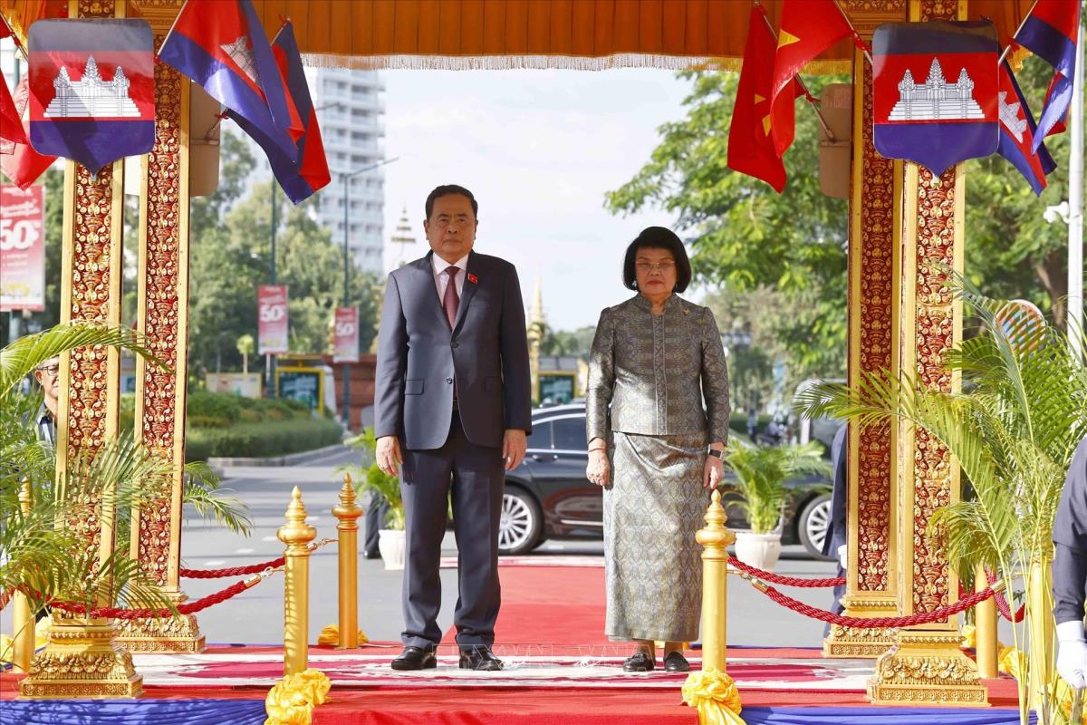 [Ảnh trên: Chủ tịch Quốc hội Trần Thanh Mẫn và Chủ tịch Quốc hội Campuchia Samdech Khuon Sudary trên bục danh dự, thực hiện nghi lễ chào cờ, trong lễ đón Chủ tịch Quốc hội Trần Thanh Mẫn thăm chính thức Campuchia (21/11/2024). Ảnh: Doãn Tấn/TTXVN]